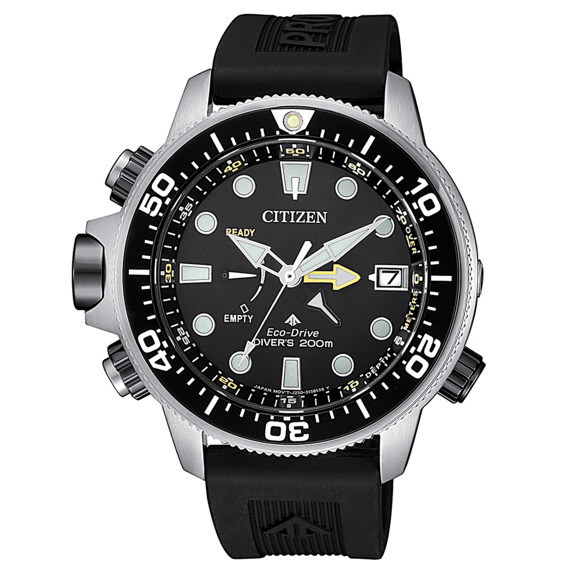 Cassa in acciaio con corone e pulsati serrati a vite. Ghiera girevole unidirezionale. Cinturino in poliuretano. Vetro con trattamento antiriflesso. Fondo serrato a vite. Diver's 200 mt.