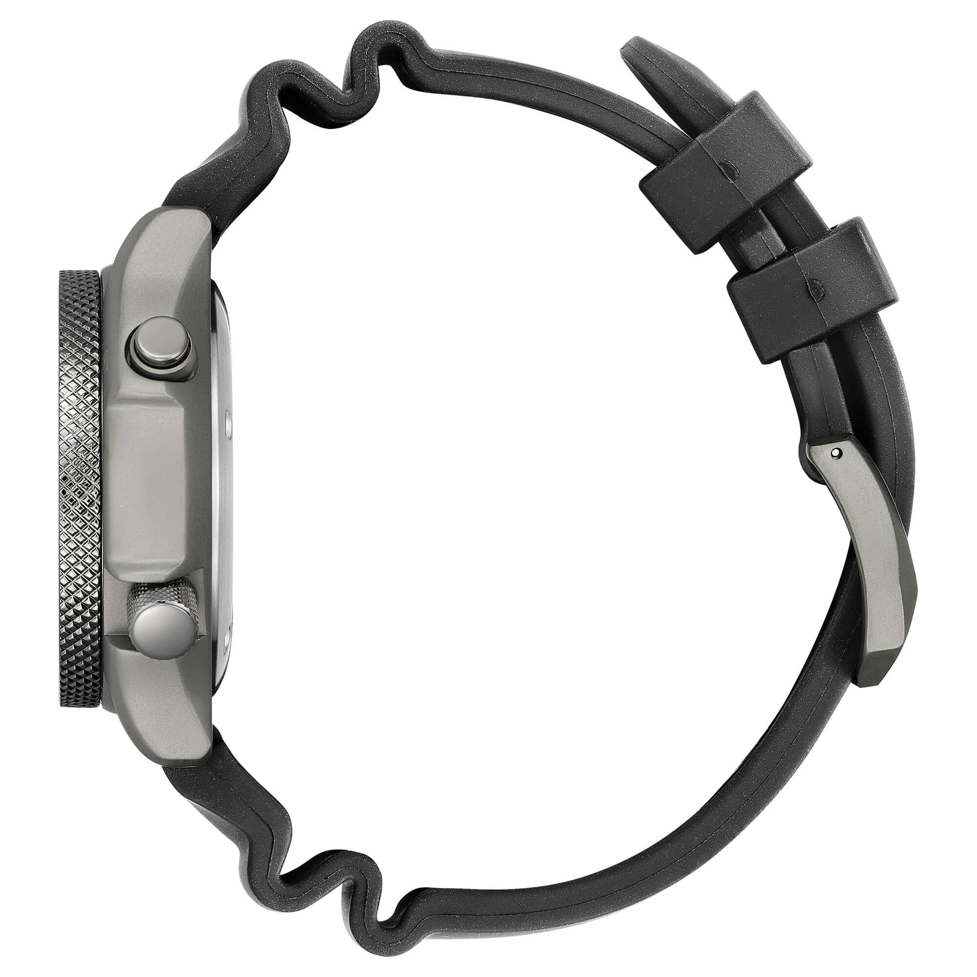 Cassa in acciaio con finitura IPgrey, cinturino in morbido poliuretano. Indici e sfere ad alta visibilità. Fondo e corona serrati a vite. Ghiera girevole unidirezionale zigrinata. Vetro minerale. WR 20 bar.
