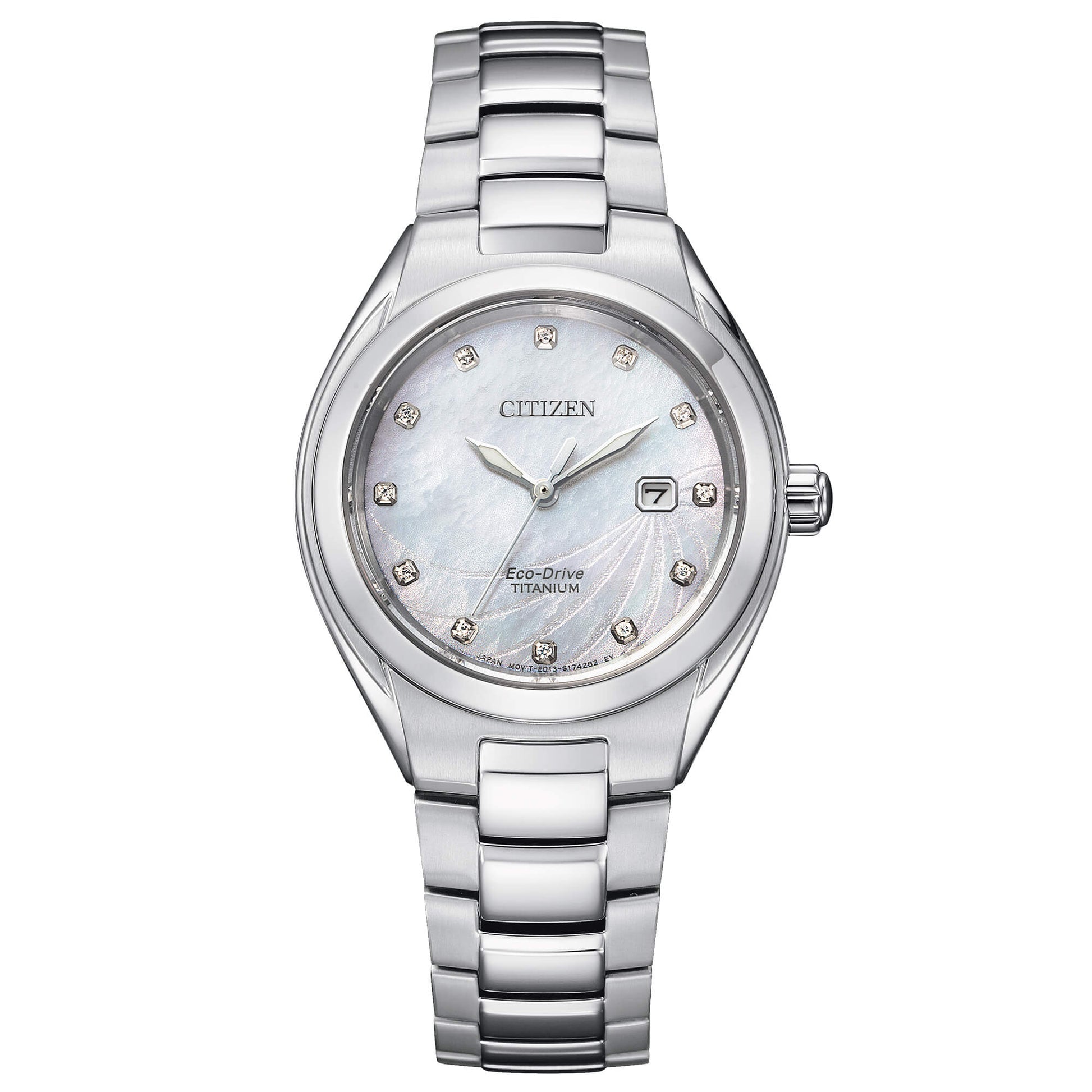 Cassa e bracciale in Super Titanio con finitura al platino. Vetro zaffiro. Quadrante in madreperla con 12 diamanti. WR 10 bar.