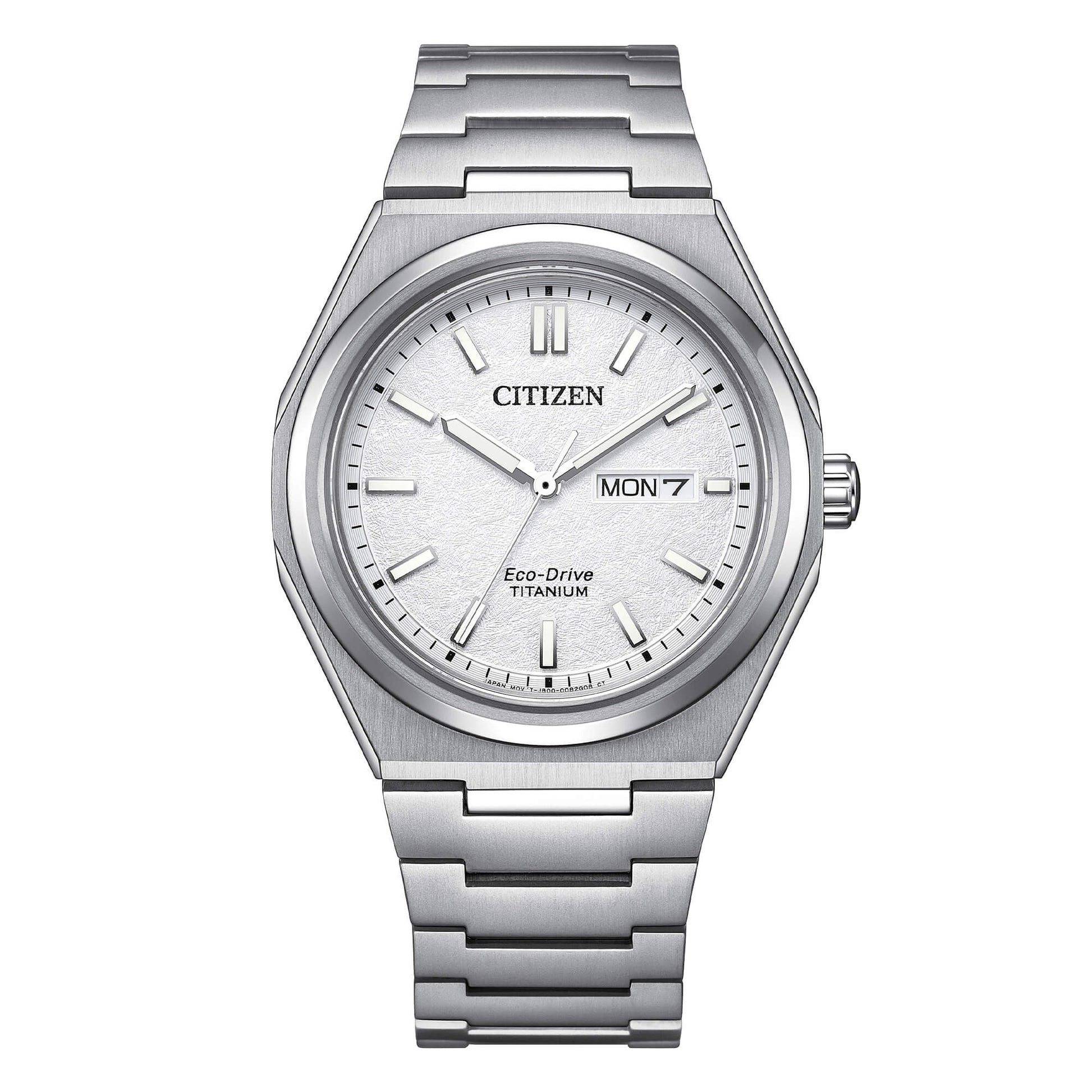 Cassa e bracciale realizzati in titanio Grado 2 lavorato con la tecnologia esclusiva Citizen Duratec che conferisce un elevato livello di finitura estetica attraverso l’alternanza di superfici lucide e spazzolate e al tempo stesso ne incrementa la resistenza all’abrasione di oltre 5 volte rispetto all’acciaio inox. Fondo serrato a vite. Quadrante con pattern materico ispirato alla granulometria tipica del titanio. Vetro zaffiro. WR 10 bar.